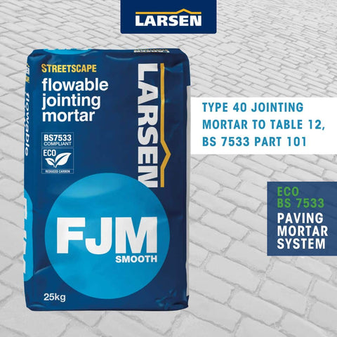Larsen Flowable Jointing Mortar FJM Eco Smooth is a premium, flowable jointing mortar designed for smooth, professional finishes on paving, patios, and driveways. Its eco-friendly formula makes it safe and easy to use, providing strong, durable joints while allowing water permeability for sustainable installations.