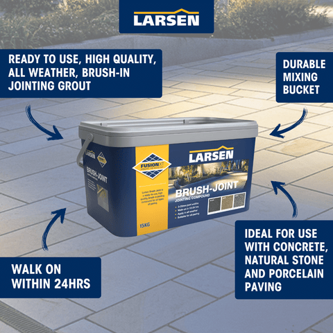 Larsen Fusion XT Brush-Joint is a high-performance, ready-to-use brush-in jointing compound designed for paving, patios, and outdoor surfaces. Its smooth, easy-to-apply formula fills joints quickly, creating a durable, weather-resistant finish suitable for concrete, natural stone, and porcelain paving.